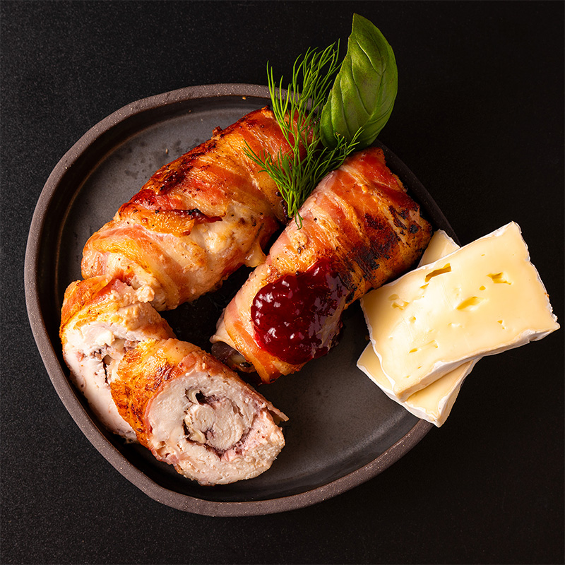 - Kanafileerull peekoni ja Brie juustuga, vahtrasiirupi-sinepikastmes